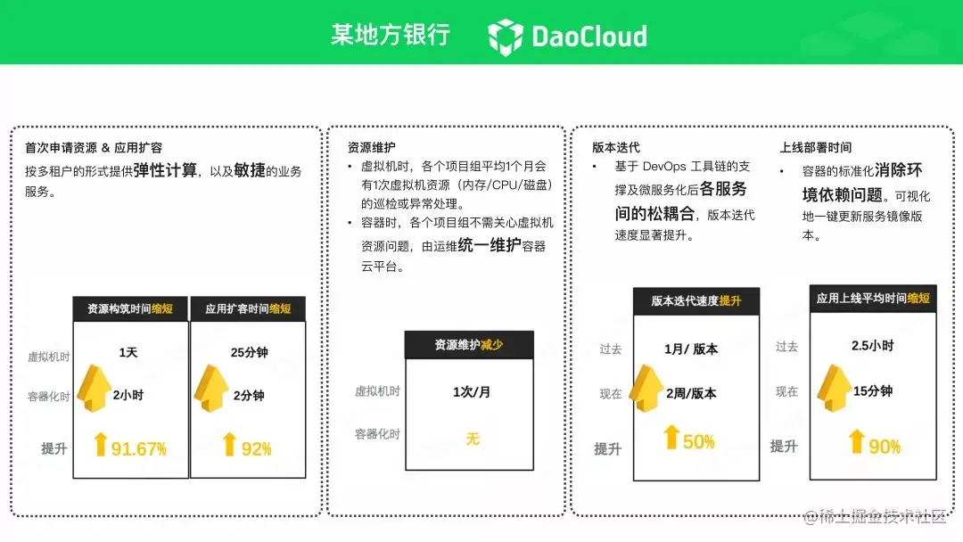 虚拟机容器环境vs裸金属容器环境裸金属容器部署、管理和故障排查需要的团队人员更少,但支撑的应用密度更高,这也是「DaoCloud 道客」 云原生一体机采用智能裸金属架构的原因。转型三:现代容器化Gartner 预测,到 2023 年,70% 的组织将在生产中运行更多容器化应用[1]。容器、DevOps 和微服务应用模式,是企业 IT 创新和数字化转型的三大驱动力。企业采用这些技术,可以发挥其在应用开发和部署方面的优势。