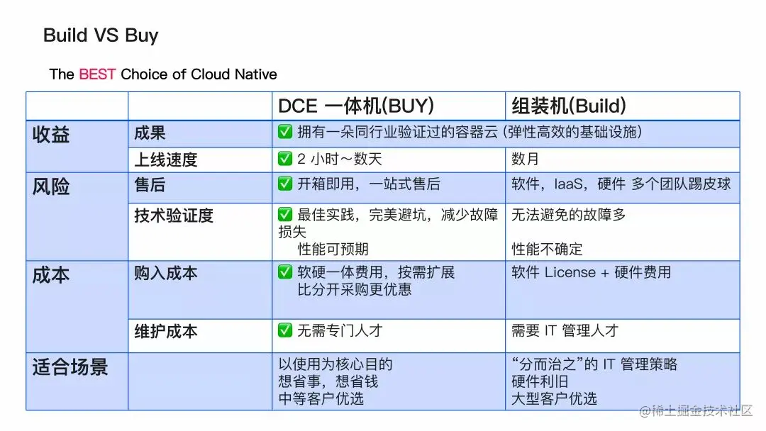 为什么要选择「DaoCloud 道客」 云原生一体机,而不是自主构建一个自定义的解决方案? 企业确实可以选择自己构建一个完全自定义的容器解决方案,整合计算、存储、网络、数据保护和实时监控,然后想办法让所有这些组件协同工作,但这会很耗时。而真相往往就是:理想很丰满,现实很骨感。因为规划、设计和构建综合的 IT 解决方案,是一项复杂的工程,往往需要几个月或几年的开发时间才能实现。如果企业想要推出一个解决方案,来迅速解决眼前业务的急迫需求,那么这个时间就太长了,而且后续的长期维护或更新成本也很高。实际上大部分 IT 部门难以独立构建和维护一个功能完全、弹性伸缩的容器云平台,因为这样企业需要投入许多 IT 人力资源和预算资金,而不能专注于业务创新和附加值服务。