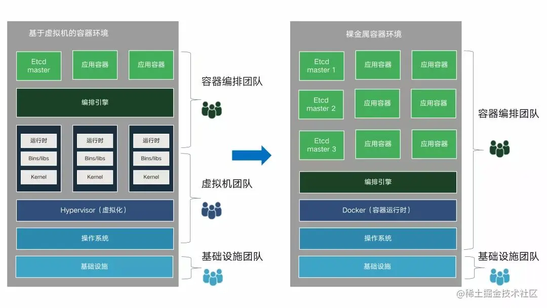 过去的 15 年,服务器虚拟化是企业数据中心应用部署的首选方法。Hypervisor 虚拟机管理程序几乎无处不在,基础设施即服务 (IaaS) 最常见的售卖单位:是虚拟机 (VM)。然而在云原生时代,很多应用需要同时部署在企业内部和云环境中,另外企业为了加快新应用的上线速度,除了在虚拟机中运行单体应用外,还要部署容器化应用。但是在虚拟机环境之上部署容器,容器在其中只是另一种形式的虚拟层。这样就需要两种 IT 运维人员,一种使用和管理容器环境,另一种管理虚拟机环境,运维很可能需要两套班子。并且,在实际工作中,无论容器和虚拟机两个团队合作得多好,都会不可避免地出现沟通问题、重复劳动等,经常出现一个团队等待另一个团队的情况,不可避免会产生延迟,降低总体工作效率。由此,越来越多的企业意识到容器应该部署在裸金属服务器上,因为在裸金属服务器上: