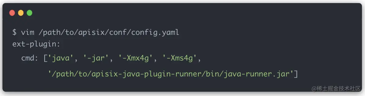 首先将 Runner 及项目中的插件编译为 jar 包,并将 jar 包的绝对路径配置到 APISIX 主配置文件中,配置方式如下: