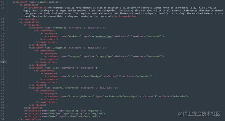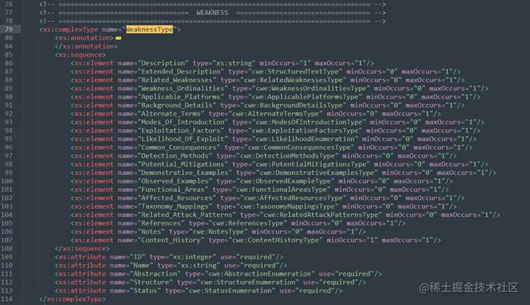 这个节点下定义每个CWE弱点的主要地方,这里有我们了解的必须的节点,例如CWE的ID,名字(Name), 描述(Description)等,以及组成每个CWE的其他节点的定义。