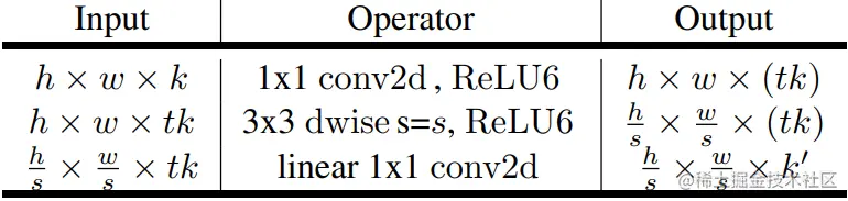 上图就是论文中展示的各种结构的对比,a是普通卷积结构,b是深度分离卷积结构,c是有bottlenect的分离卷积,d是对bottlenect进行扩张后的分离卷积。图中所有虚线的tensor后面都是线性激活。d的结构和导致残差结构就是有无shorcut连接的差别,详细的计算如下图。