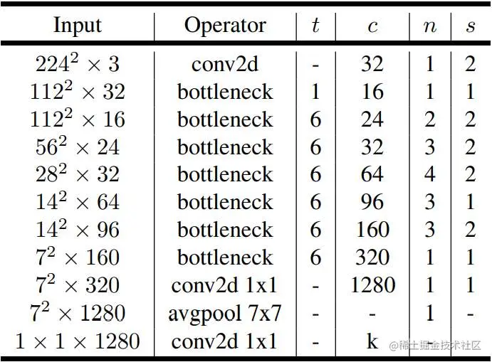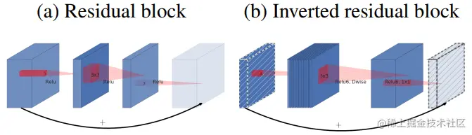 倒置残差(Inverted residuals): 可以非常有效的解决线性瓶颈的问题。因为考虑到如果channel比较少的时候,tensor的信息会特别集中,在使用非线性激活会造成信息的损失,应对的策略可以是对channel比较少的tensor进行channel的扩张。而残差block是先进行channel缩减,然后扩张,这样可能会丢失信息。作者就设计了一种倒置的残差block,先进行channel扩张,然后进行channel缩减。如下图显示对比,虚线的tensor后进行线性激活,这种倒置残差block是作者对残差block提出的一个改进。详细结构如下图所示