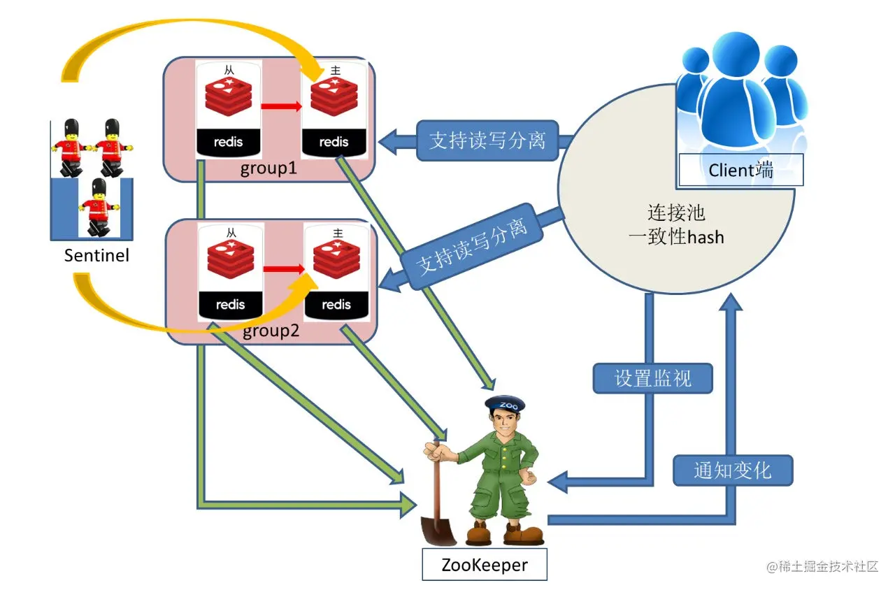 通过 sentinel 实现集群高可用,分区逻辑在客户端实现