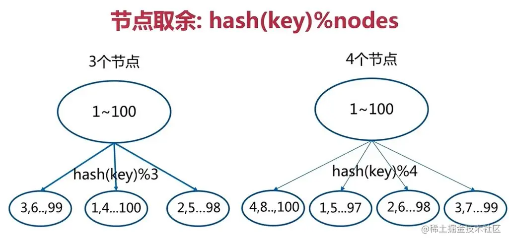 - 当使用少量节点 时,节点变化将大范围影响哈希环 中数据映射,不适合少量数据节点 的分布式方案。