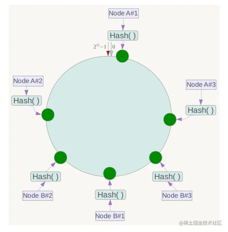 例如:我们以 2 个副本 NodeA、NodeB 为例,为每台服务器计算三个虚拟节点,于是可以分别计算 “Node A#1”、“Node A#2”、“Node A#3”、“Node B#1”、“Node B#2”、“Node B#3”的哈希值,于是形成六个虚拟节点: