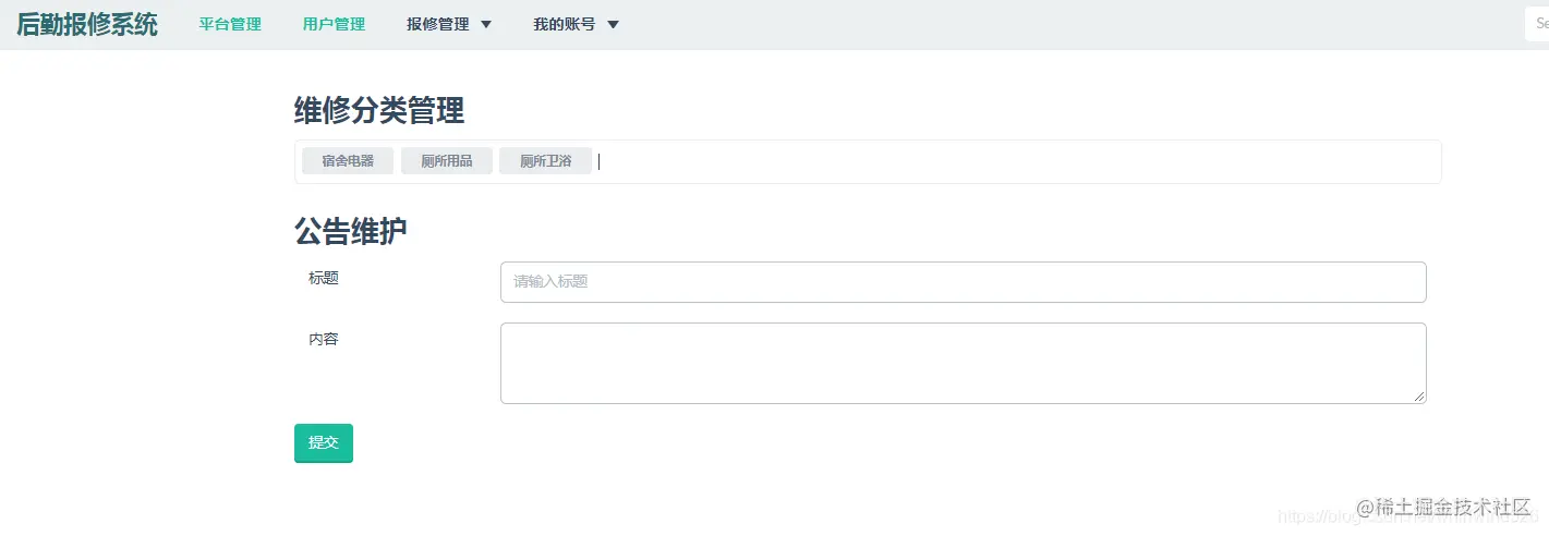 - 管理员角色:admin / 123456 主要可以管理用户信息,报修分配维修人员,发布公告,维修类型管理,个人资料修改等功能