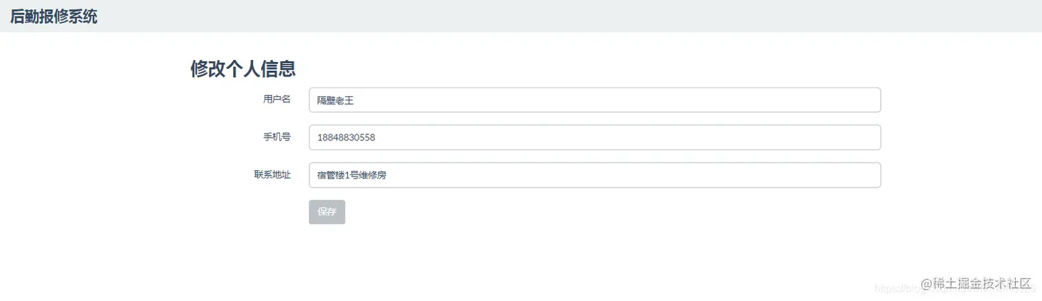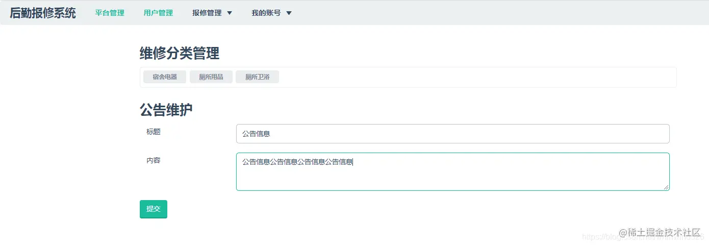 - 普通用户:loguser / 123456 主要可以进行宿舍问题报修,查询报修记录,对报修结果进行评价,查看公告,修改个人资料等功能