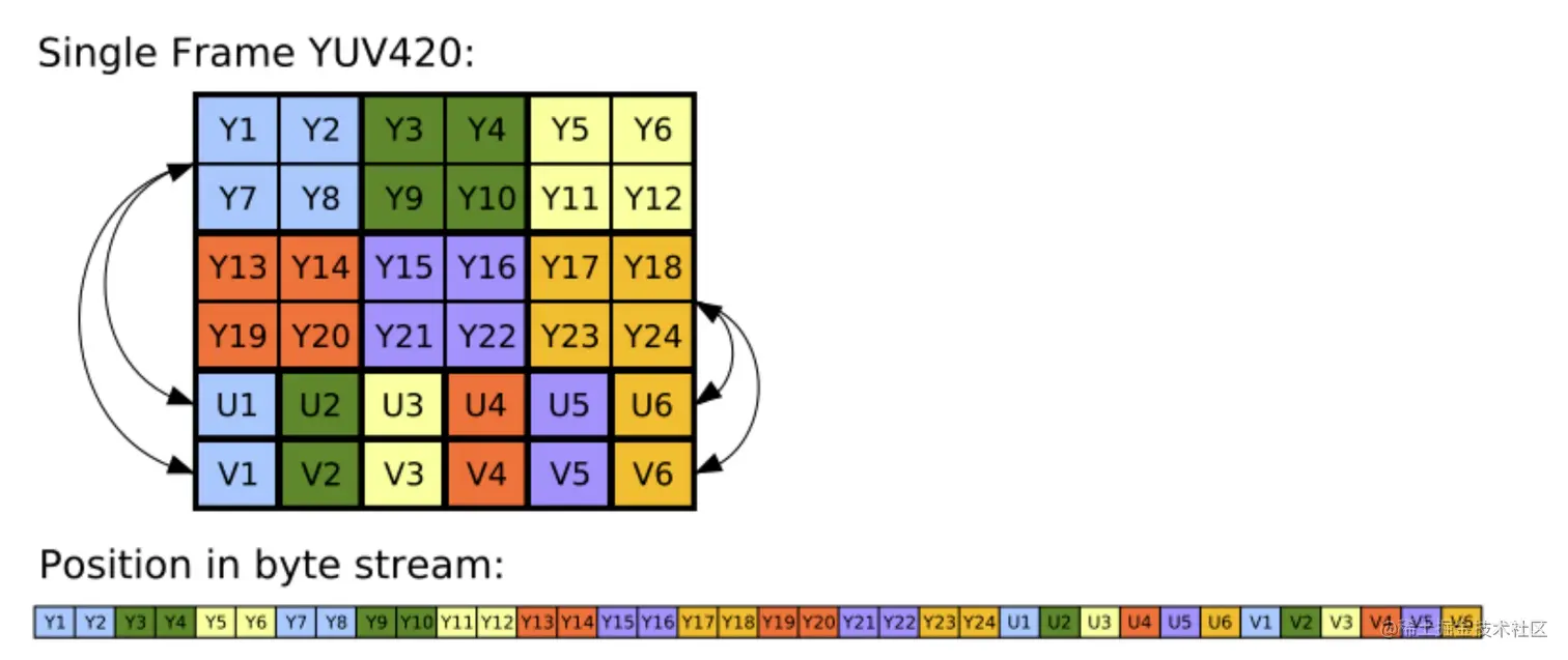 YUV 420 并不意味着不采样 V 分量,而是 4个Y 分量共享一组 UV,然后亮度透过色度来显示画面,更多 YUV 的这里就不展开讨论,而为什么使用 YUV 其中有一点因素就是为了兼容以前的黑白电视。