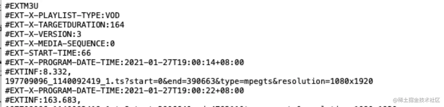 #EXT-X-PLAYLIST-TYPE:可选项,如果是 VOD 则服务器不能改变整个 ts 文件列表;如果是 EVENT 则服务器不能改变或是删除 ts 文件列表中的任何部分,但是可以向该文件新增内容; -