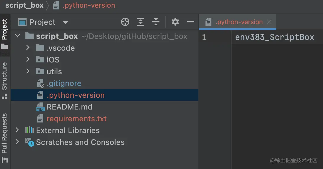 在 script_box 下存有一个名为 .python-version 的文件,里面仅写了 env383_ScriptBox,这是一个 python 虚拟环境,其作用是:当进入包含该文件所在目录时,会自动切换至该 python 虚拟环境。