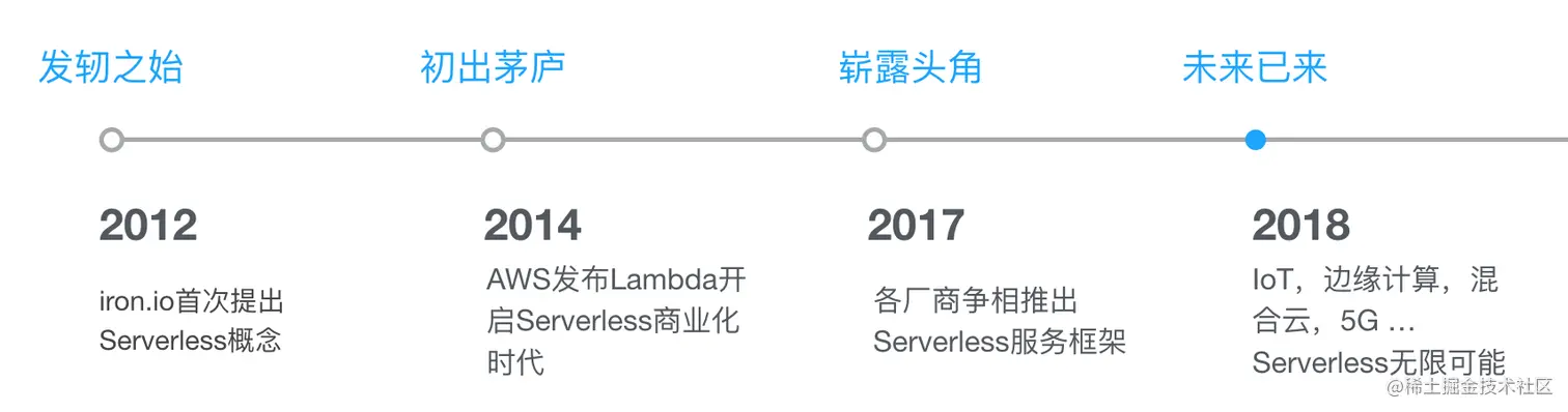 Serverless 是一种新型的互联网架构 —— 无服务器架构,这里的无服务器不是指不需要服务器,而是开发者可以不管理服务器等基础设施。其实 Serverless 也谈不上新,因为这个概念在 2012 年就已经提出了,简单看下 Serverless 的发展历史: