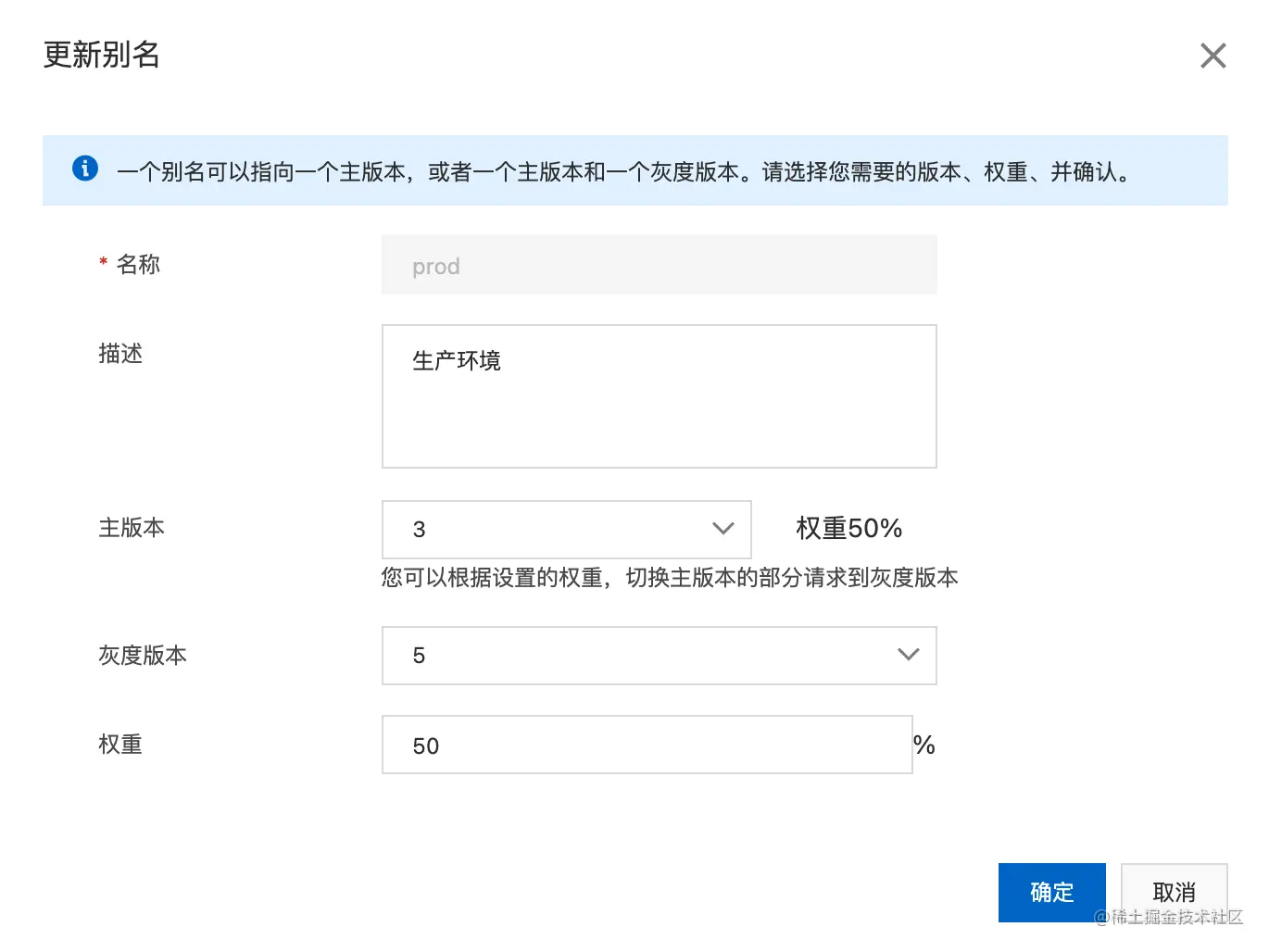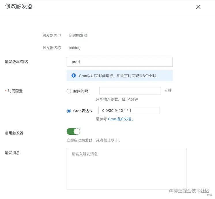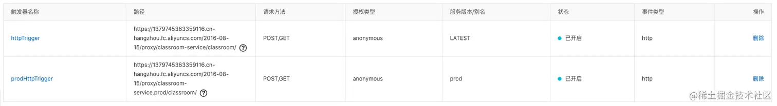 使用函数时如果需要区分生产环境和测试环境,可以发布不同的版本,并创建多个触发器,设置触发器指向不同的版本/别名,如下图: