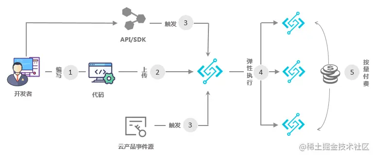 - 3、触发函数执行,触发方式包括OSS、API网关、日志服务、表格存储以及函数计算API、SDK等。