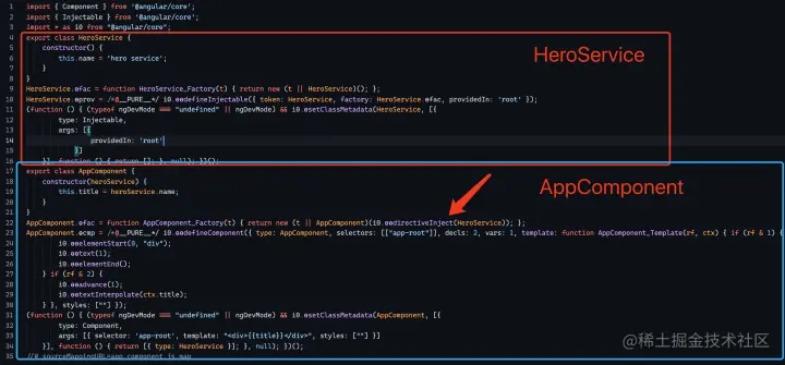 由图可知编译的产物主要分为 HeroService 和 AppComponent 两个部分,因为本文主要是讲解依赖注入的实现原理,所以对于编译产物的其他部分不做展开讲解。现在我们来重点关注一下依赖注入相关的代码,其中箭头所示代码: