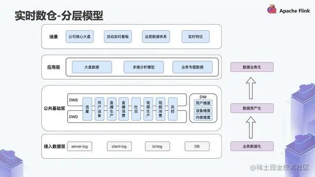 最下层有三个不同的数据源,分别是客户端日志、服务端日志以及 Binlog 日志; 在公共基础层分为两个不同的层次,一个是 DWD 层,做明细数据,另一个是 DWS 层,做公共聚合数据,DIM 是我们常说的维度。我们有一个基于离线数仓的主题预分层,这个主题预分层可能包括流量、用户、设备、视频的生产消费、风控、社交等。DWD 层的核心工作是标准化的清洗;DWS 层是把维度的数据和 DWD 层进行关联,关联之后生成一些通用粒度的聚合层次。 再往上是应用层,包括一些大盘的数据,多维分析的模型以及业务专题数据; 最上面是场景。 整体过程可以分为三步: