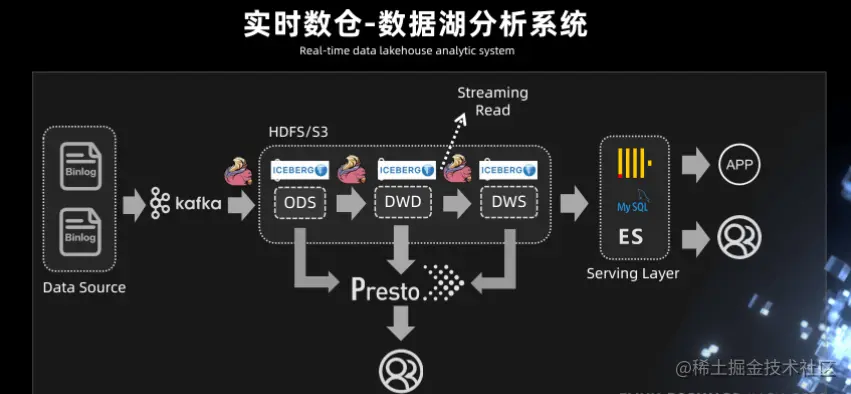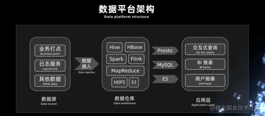 在数仓体系中会有各种各样的大数据组件,譬如 Hive/HBase/HDFS/S3,计算引擎如 MapReduce、Spark、Flink,根据不同的需求,用户会构建大数据存储和处理平台,数据在平台经过处理和分析,结果数据会保存到 MySQL、Elasticsearch 等支持快速查询的关系型、非关系型数据库中,接下来应用层就可以基于这些数据进行 BI 报表开发、用户画像,或基于 Presto 这种 OLAP 工具进行交互式查询等。