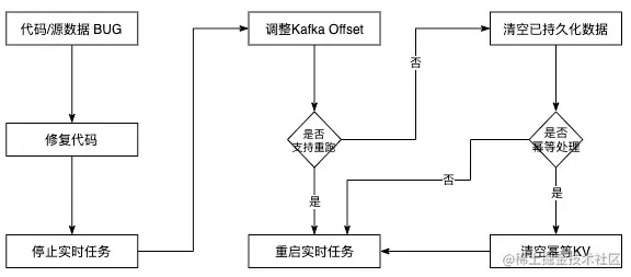 实时任务一旦上线就要求持续不断的提供准确、稳定的服务。区别于离线任务按天调度,如果离线任务出现 Bug,会有充足的时间去修复。如果实时任务出现 Bug,必须按照提前制定好的流程,严格按照步骤执行,否则极易出现问题。造成 Bug 的情况有非常多,比如代码 Bug、异常数据 Bug、实时集群 Bug,如下图展示了修复实时任务 Bug 并恢复数据的流程。