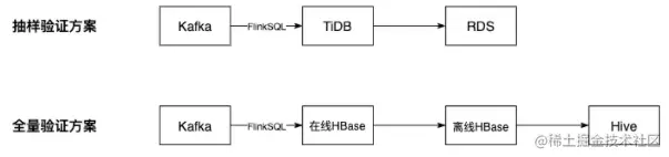 由于实时数仓的数据是无边界的流,相比于离线数仓固定不变的数据更难验收。基于不同的场景,我们提供了 2 种验证方式,分别是:抽样验证与全量验证。如图 3.3 所示