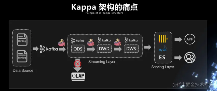 首先,在构建实时业务场景时,会用到 Kappa 去构建一个近实时的场景,但如果想对数仓中间层例如 ODS 层做一些简单的 OLAP 分析或者进一步的数据处理时,如将数据写到 DWD 层的 Kafka,则需要另外接入 Flink。同时,当需要从 DWD 层的 Kafka 把数据再导入到 Clickhouse,Elasticsearch,MySQL 或者是 Hive 里面做进一步的分析时,显然就增加了整个架构的复杂性。
