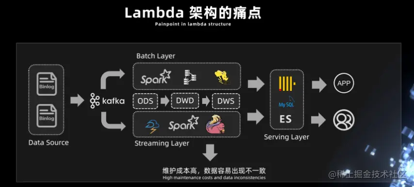 很显然在这个过程中,由于两个过程运行的时间是不一样的,跑的数据却相同,因此可能造成数据的不一致。因为某一条或几条数据的更新,需要重新跑一遍整个离线分析的链路,数据更新成本很大,同时需要维护离线和实时分析两套计算平台,整个上下两层的开发流程和运维成本其实都是非常高的。