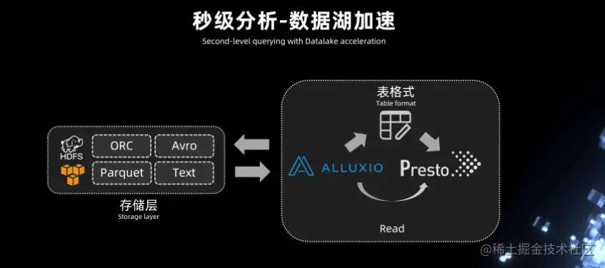 由于 Iceberg 本身是将数据文件全部存储在 HDFS 上的,HDFS 读写这块对于秒级分析的场景,还是不能够完全满足我们的需求,所以接下去我们会在 Iceberg 底层支持 Alluxio 这样一个缓存,借助于缓存的能力可以实现数据湖的加速。这块的架构也在我们未来的一个规划和建设中。