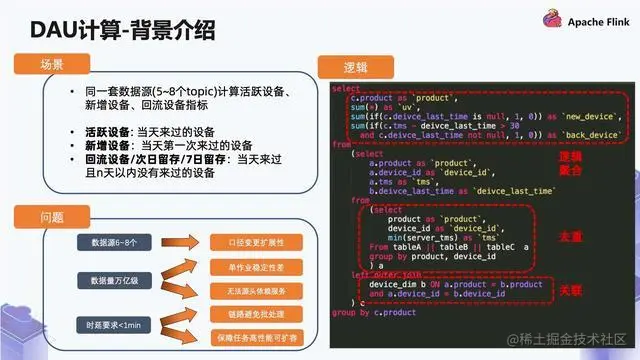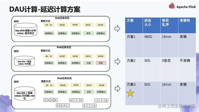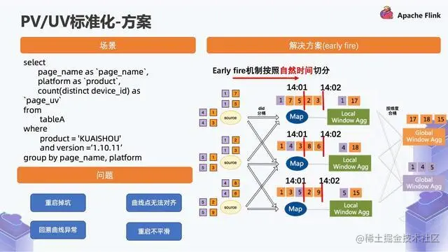 我们用到了 Flink SQL 的 Early Fire 机制,从 Source 数据源取数据,之后做了 DID 的分桶。比如最开始紫色的部分按这个做分桶,先做分桶的原因是防止某一个 DID 存在热点的问题。分桶之后会有一个叫做 Local Window Agg 的东西,相当于数据分完桶之后把相同类型的数据相加。Local Window Agg 之后再按照维度进行 Global Window Agg 的合桶,合桶的概念相当于按照维度计算出最终的结果。Early Fire 机制相当于在 Local Window Agg 开一个天级的窗口,然后每分钟去对外输出一次。
