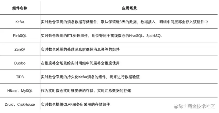 实时数仓 ETL 处理过程所涉及的组件比较多,接下来盘点构建实时数仓所需要的组件以及每个组件的应用场景。如下图所示: