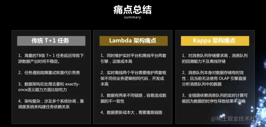 那么有没有这样一个架构,既能够满足实时性的需求,又能够满足离线计算的要求,而且还能够减轻运维开发的成本,解决通过消息队列构建 Kappa 架构过程中遇到的一些痛点?答案是肯定的,后面的篇幅会详细论述。