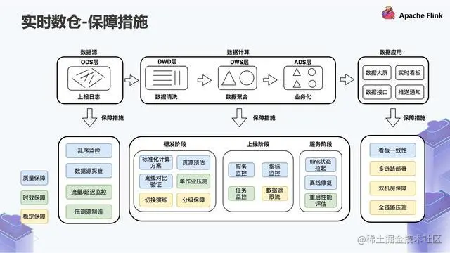 我们先看蓝色部分的质量保障。针对质量保障,可以看到在数据源阶段,做了如数据源的乱序监控,这是我们基于自己的 SDK 的采集做的,以及数据源和离线的一致性校准。研发阶段的计算过程有三个阶段,分别是研发阶段、上线阶段和服务阶段。研发阶段可能会提供一个标准化的模型,基于这个模型会有一些 Benchmark,并且做离线的比对验证,保证质量是一致的;上线阶段更多的是服务监控和指标监控;在服务阶段,如果出现一些异常情况,先做 Flink 状态拉起,如果出现了一些不符合预期的场景,我们会做离线的整体数据修复。