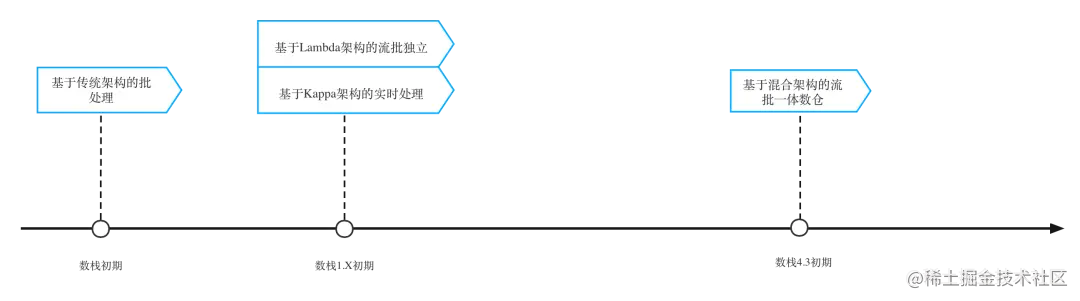 随着客户体量增大,客户需求逐步增加,面对PB级别的批数据和流数据的处理需求,数栈技术团队面临越来越多的挑战,在这个过程中逐步完善了数栈数仓架构体系。从2017年的基于传统架构的批处理经过4年迭代到基于混合架构的流批一体数仓,如图: