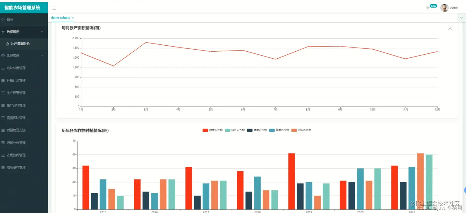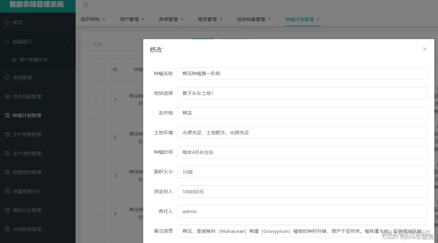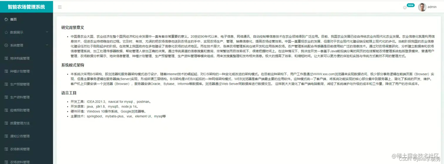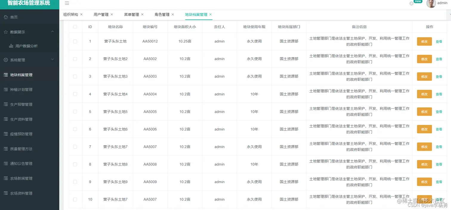 中国是农业大国,农业经济在整个国民经济和社会发展中一直有着非常重要的意义。20世纪90年代以来,电子信息、网络通讯、自动控制等信息技术在农业领域得到广泛应用。目前,我国农业发展已经由传统农业向现代化农业发展。农业信息化就是利用信息技术,促进农业持续稳定的过程。它及时、有效、尤误的把农场信息他送到农场主的手中,实现农场生产、管理、销售信息化,提高农场经营效率。中国一直重视农业的发展,但是对于农业现代化建设缺没能跟上现代化的步伐。当前阶段我国的农业信息化建设任然处于刚刚起步的阶段。在政策上我国政府在多地建设了信息化农场的试点地区。而在技术层次,各类农场管理系统也被开发和应用各类农场。农产管理系统配合传感器是目前使用较广泛的信息技术。通过对农场调查研究,分析建立数据库和农场信息管理系统、加工处理传感器数据,帮助管理人做出正确的决策。通过传统渠道的信息搜集和查询,非常繁琐而目效率低下,很难把握时间上。在这种情况下,我决定开发一套基于Java前后端分离的网页的在线智能农场管理系统包括登录模块,普通用户管理,农场数据分析展示、地块信息管理、种植计划管理、生产预警管理、生产资料管理等模块组成,用来发搜集整理和发布相关信息。极大的提高了效率,和缩短时间。让大家可以更方便的体验和实践与传统方式截然不同的管理方式。