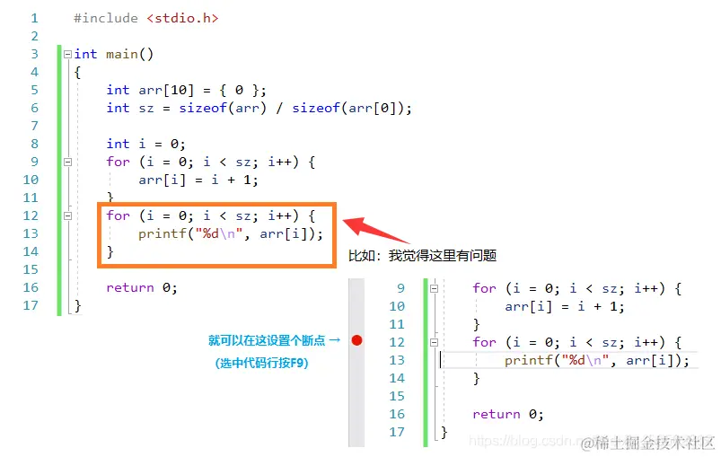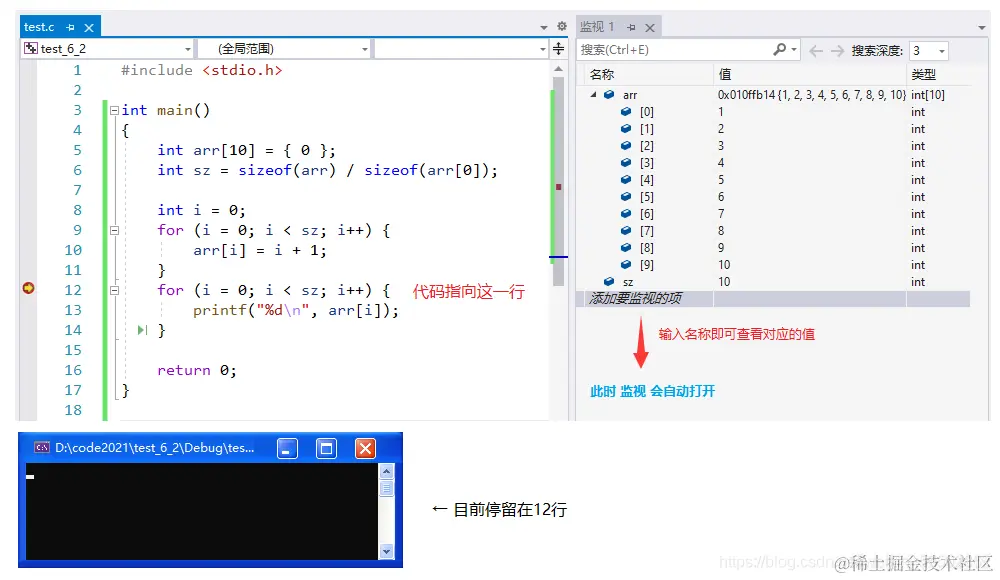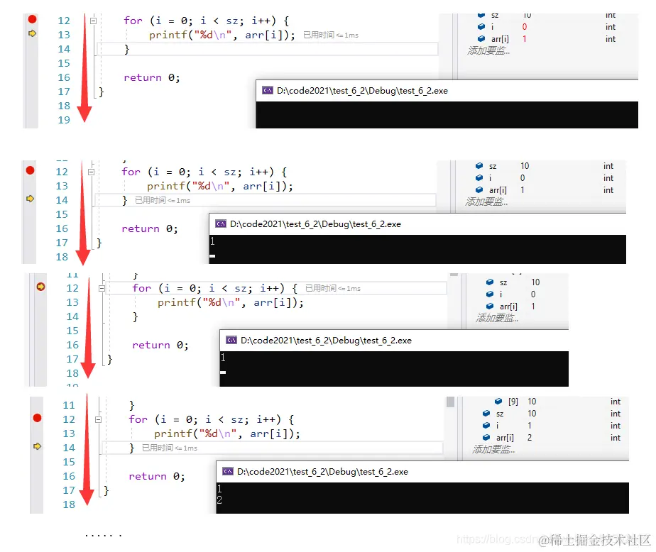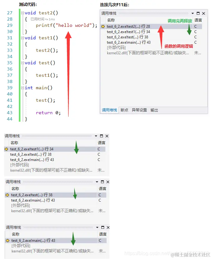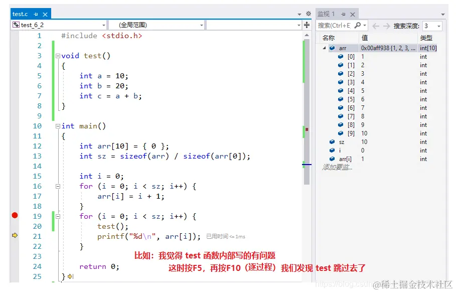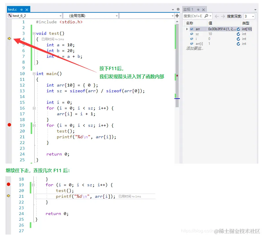 📌 注意事项:F10 和 F11 大部分情况是一样的,区别在于 F11 遇到函数时可以进到函数内部去,函数的内部也可以一步步观察,而 F10 遇到函数调用完之后就跳出去了;
