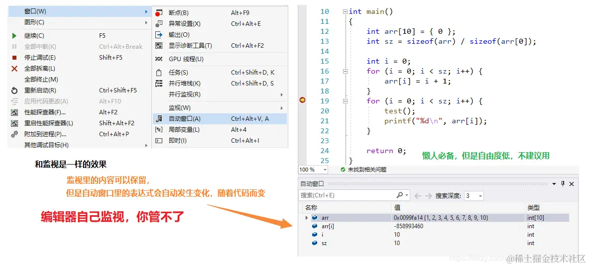 ① 自动窗口和监视是一样的效果,但是自动窗口里的表达式会自动发生变化;
