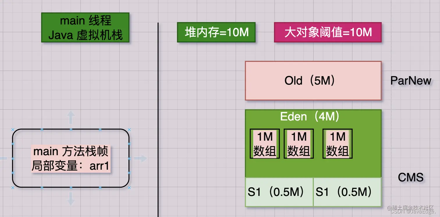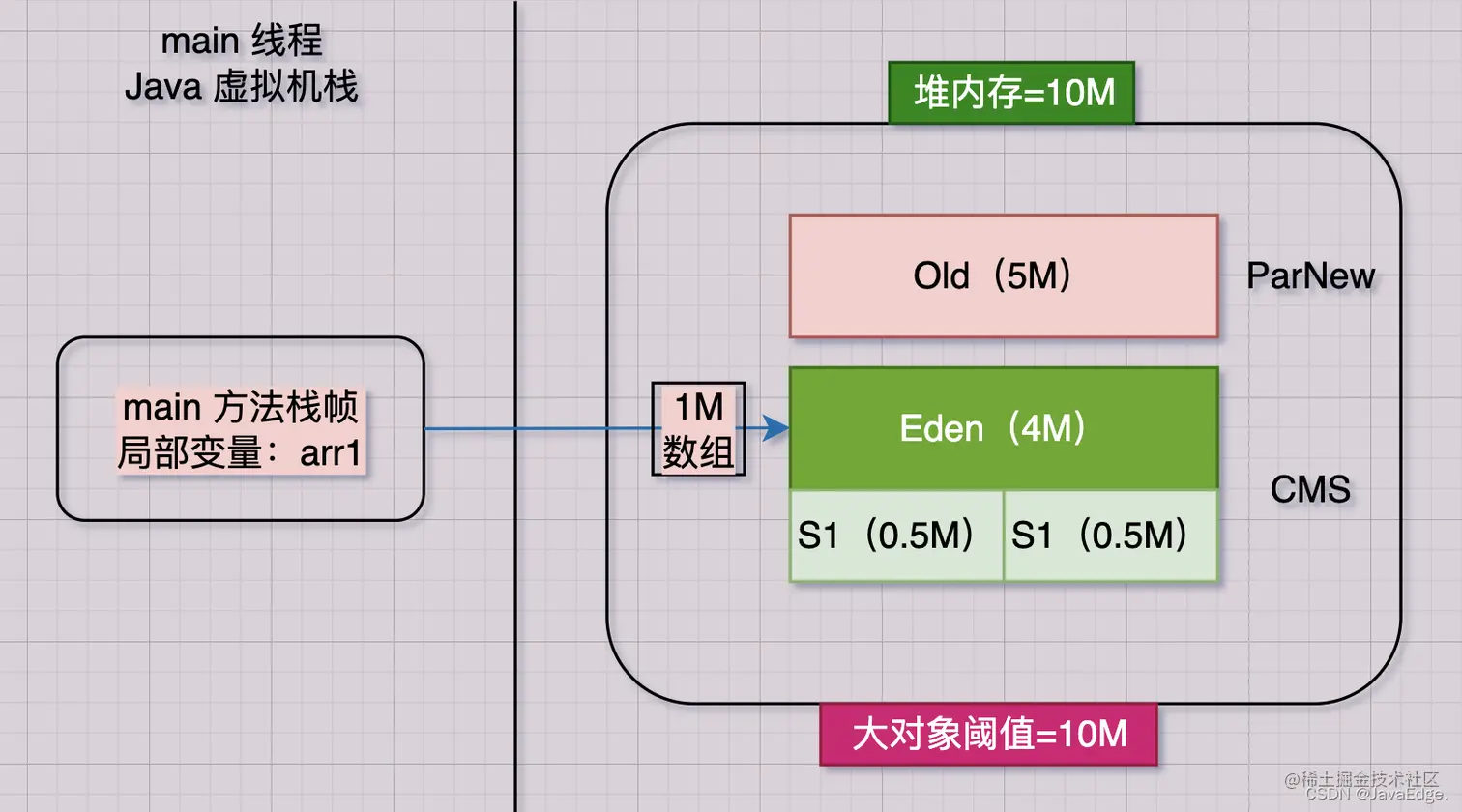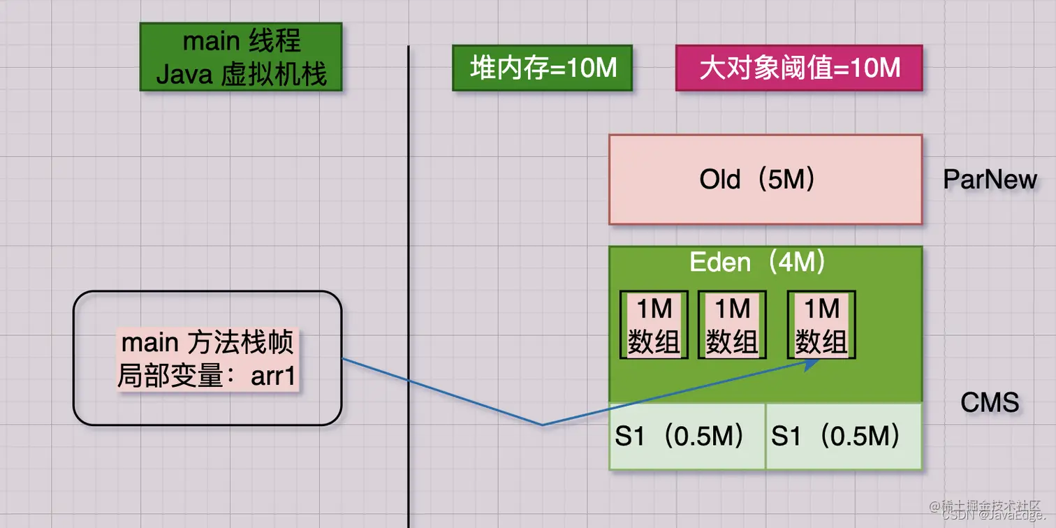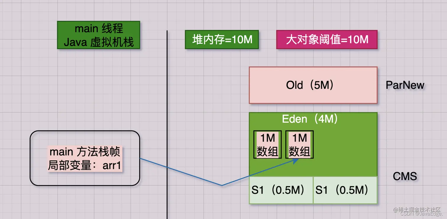 该行会在JVM Eden内放入一个1M数组,同时在main线程的虚拟机栈压入一个main方法栈帧,其栈帧内部有一“arr1”变量,该变量指向Eden的那1M数组: