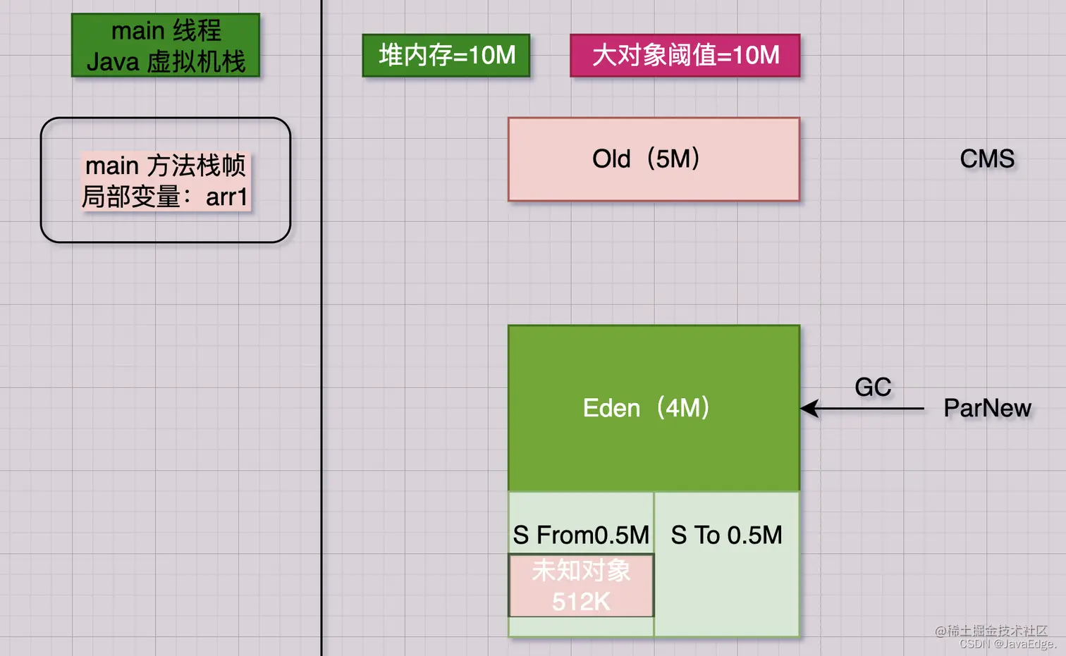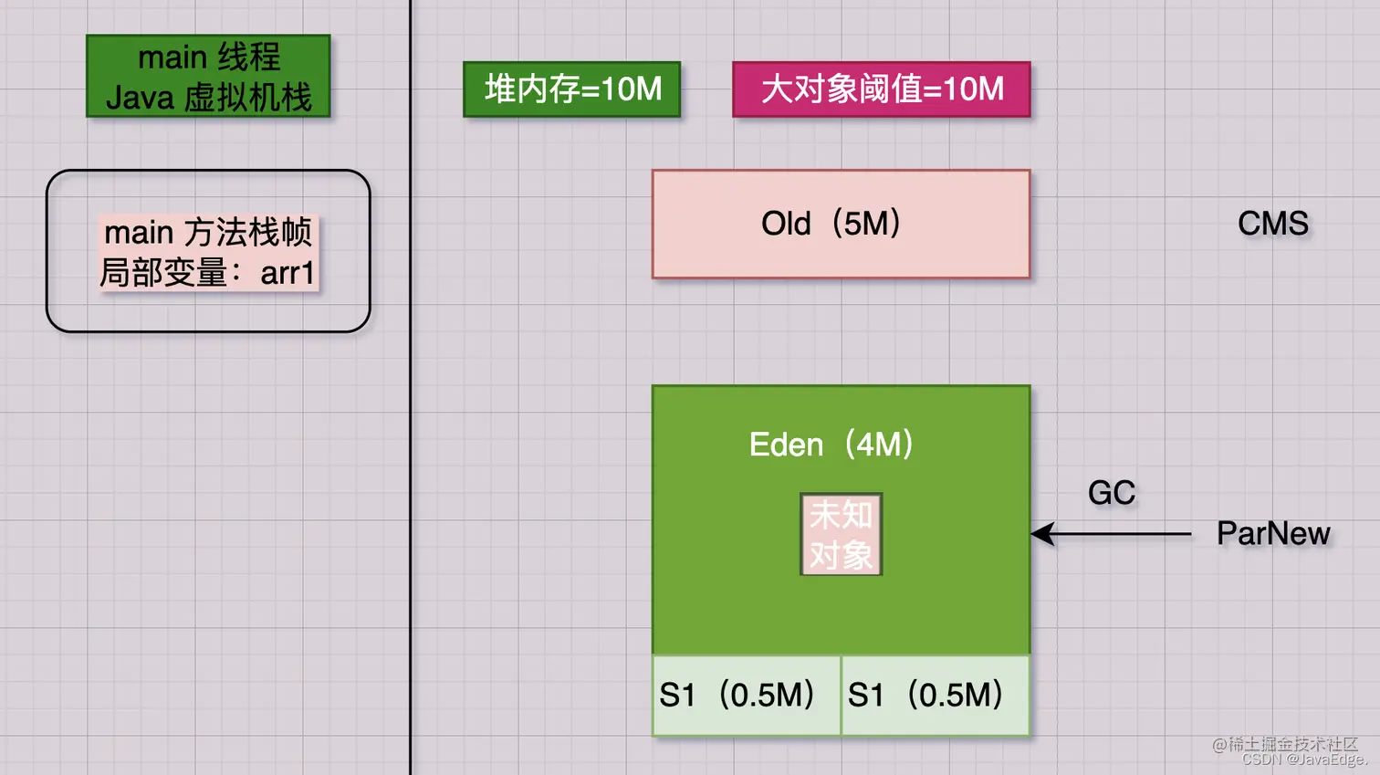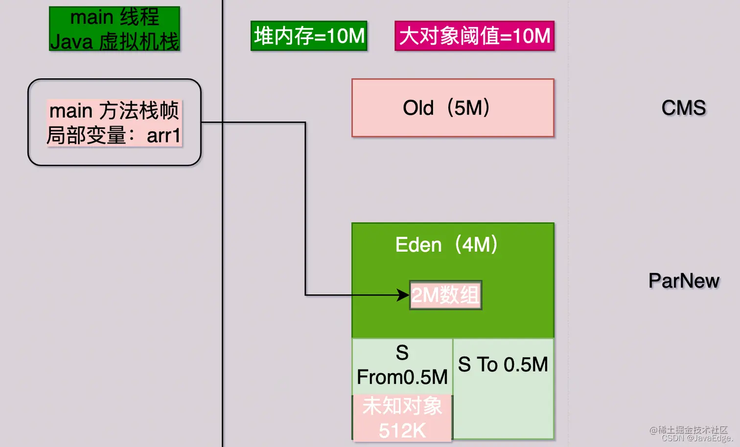 该行会在JVM Eden内放入一个1M数组,同时在main线程的虚拟机栈压入一个main方法栈帧,其栈帧内部有一“arr1”变量,该变量指向Eden的那1M数组: