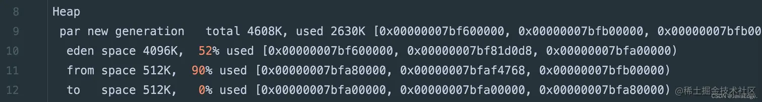 新生代可用空间4608KB,约4.5MB,Eden是4M,两个Survivor只有一个可放存活对象,另外一个必须保持空闲,所以年轻代可用空间是 Eden+1个Survivor=4.5MB。