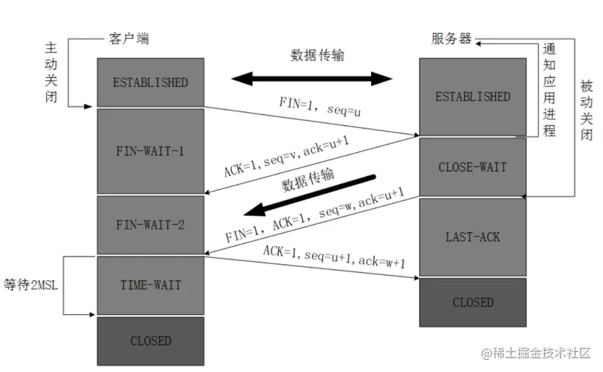 1)客户端进程发出连接释放报文,并且停止发送数据。释放数据报文首部,FIN=1,序列号=u,此时客户端进入FIN-WAIT-1状态,TCP规定,FIN报文段即使不携带数据,也要消耗一个序号。