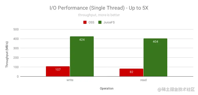再结合 JuiceFS 的智能预读和回写算法,很容易充分利用网络带宽和多核 CPU 的能力,将文本文件的处理性能推向极致。下图是单线程顺序 I/O 性能测试结果,显示了 JuiceFS 对大文件(使用不能被压缩的随机数据)的读写提速是非常显著的。