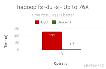 类似的还有 du 操作,它是要看一个目录里所有文件的总大小,在管理容量或者了解数据规模时非常有用。 下图是对一个 100GB 数据(包含3949个子目录和文件)的目录做 du 的时间对比,JuiceFS 比 OSS 快 76倍!这是因为 JuiceFS 的 du 是基于服务器端内存中实时统计好的大小即时返回的,而 OSS 需要通过客户端遍历目录下的所有文件再累加求和,如果目录下的文件更多的话,性能差距会更大。