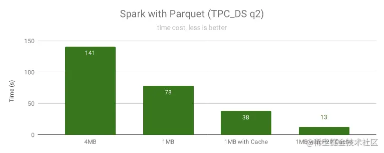 启用缓存后,Spark 可以直接从缓存的数据块上做随机读,大大的提高了随机读性能。因为 SparkSQL 会将小文件随机合并到一个任务中,导致大部分文件没办法调度到有缓存的那个节点,缓存命中率很低,部分未命中缓存的读请求只能读对象存储,严重拖慢了整个任务。