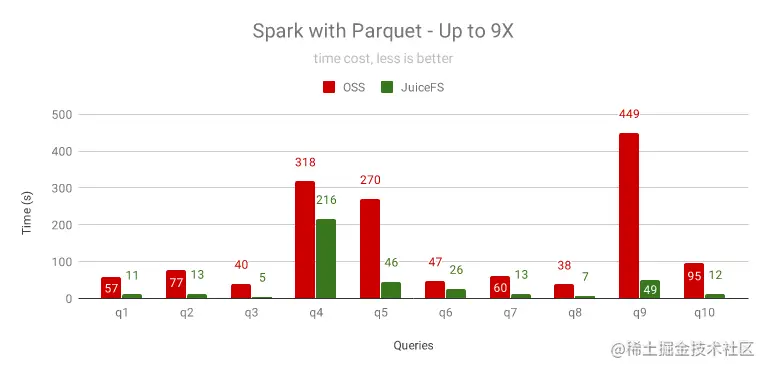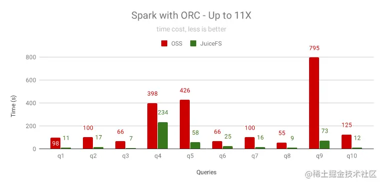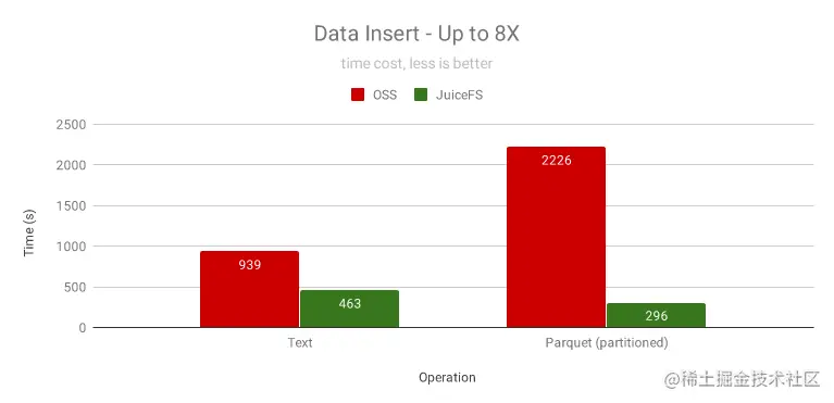 我们对比了未分区的文本格式和按日期分区的 Parquet 格式,JuiceFS 都有显著性能提升,尤其是分区的 Parquet 格式。通过分析发现,OSS 花了很多时间在 Rename 上,它需要拷贝数据,还不能并发,而 Rename 在 JuiceFS 里是一个原子操作,瞬间完成。