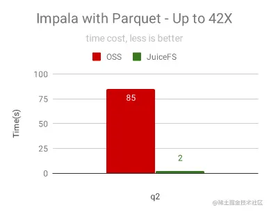 Impala 是性能非常好的交互分析引擎,对 I/O 本地化和 I/O 调度有非常好的优化,不需要使用 JuiceFS 的分布式缓存就能够获得很好的效果:为 OSS 提速 42倍!