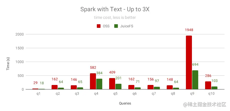 对于未分区的文本格式,需要扫描全部文本数据,主要瓶颈在 CPU,JuiceFS 的提速效果有限,最高能提升 3 倍。需要注意的是,如果使用 HTTPS 访问 OSS,Java 的 TLS 库比 JuiceFS 使用的 Go 的 TLS 库慢很多,同时 JuiceFS 对数据做了压缩,网络流量也会小很多,因此在两者都启用 HTTPS 来访问 OSS 时,JuiceFS 效果更好。