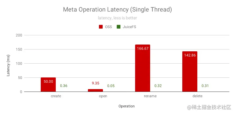 为了完整兼容 HDFS 并提供极致的元数据性能,JuiceFS 使用全内存的方式来管理元数据,将 OSS 作为数据存储使用,所有的元数据操作都不需要访问 OSS 以保证极致的性能和一致性。绝大部分元数据操作的响应时间都在 1ms 以内,而 OSS 通常要几十到一百毫秒以上。下面是使用 NNBench 进行元数据压测的结果: