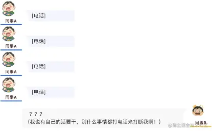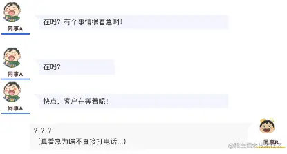 评: 短时间内大批消息提示会给人造成很大的心理压力,打断手头的工作,零碎的短句也不方便将聊天内容加入「稍后处理」或者「代办」、「任务」等,应当尽量一次性把事情说完