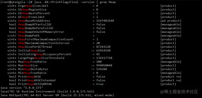 java -XX:+PrintFlagsFinal -version | grep Heap