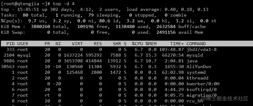 关注一下 %MEM 列,该列表示的就是当前服务器运行的程序内存的使用情况,目前来看 2104 的 mysql 服务和 9886 的 java 服务运行占用内存较高。%MEM 右侧的列是服务运行的时间, mysql 服务由于我开启了缓存,加之长时间没有重启了,目前已经累计使用cpu时间是 6w+ 分钟了, java 服务刚重启过,所以使用的 cpu 时间是 2 分钟多一点儿。这里的时间不是服务运行时间,而是服务使用 cpu 的时间,而且是多个 cpu 使用时间累加的。