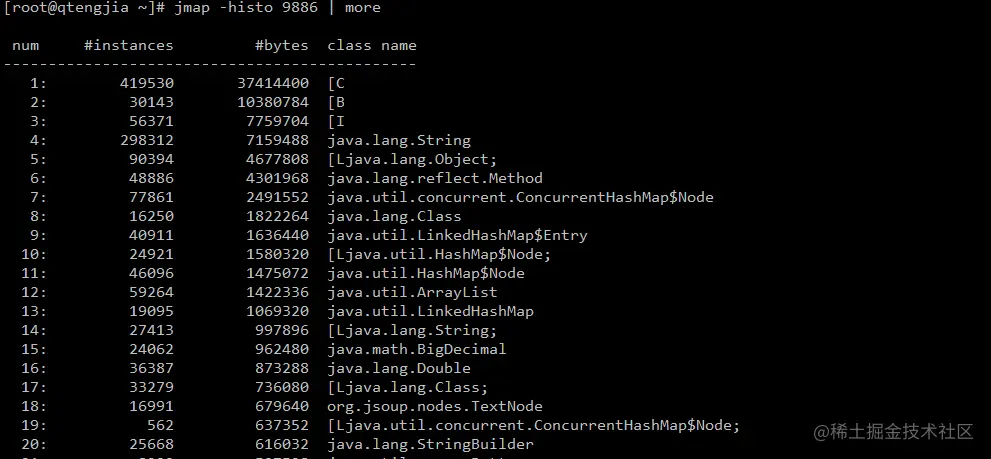 一般情况下,该命令打印的内容较多,会加上 more 命令来看前几个就可以了,打印输出的结果是按照内存占用的大小倒序排列, instances 代表实例数, bytes 代表使用的空间, class name 代表使用的类名称。从结果来看,我们可以知道 String Object 还有 HashMap 等 java 常用的类是比较消耗空间的,特别是使用 spring 等框架后,框架内部大量使用了集合框架。不过排查内存使用过高这些都不是重点,要检查自己项目中所用的类是否在头排出现,当然也可以使用 grep 命令来搜索包路径来看项目中类的内存使用情况。不过我们这种实时抓取是建立在项目还在运行的过程中,如果项目已经宕机了呢,我们就无从获取相关的信息。
