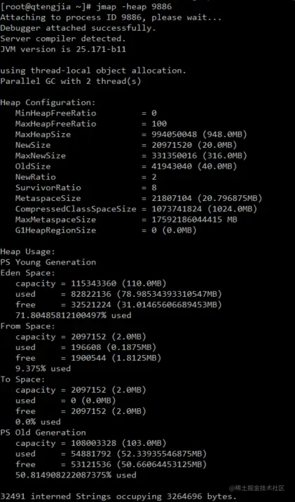 言归正传,我们就查询一个 java 进程使用内存的情况。这里需要说的是,一般不会在线上执行该命令,而是在预发灰度和测试环境执行。